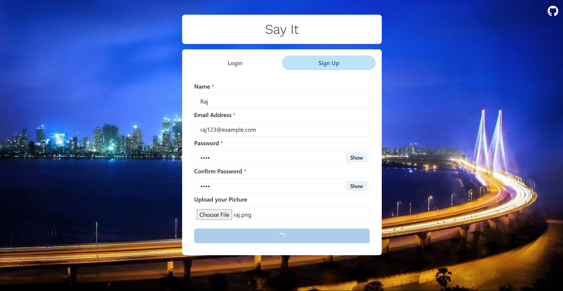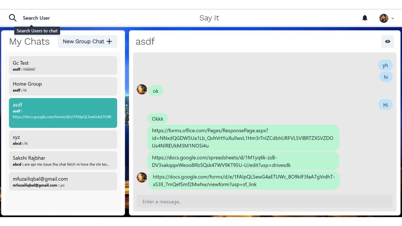 The main chat interface features real-time message delivery and group creation. Messages and media are stored securely on MongoDB Atlas with REST APIs built in Express.js and Node.js.
