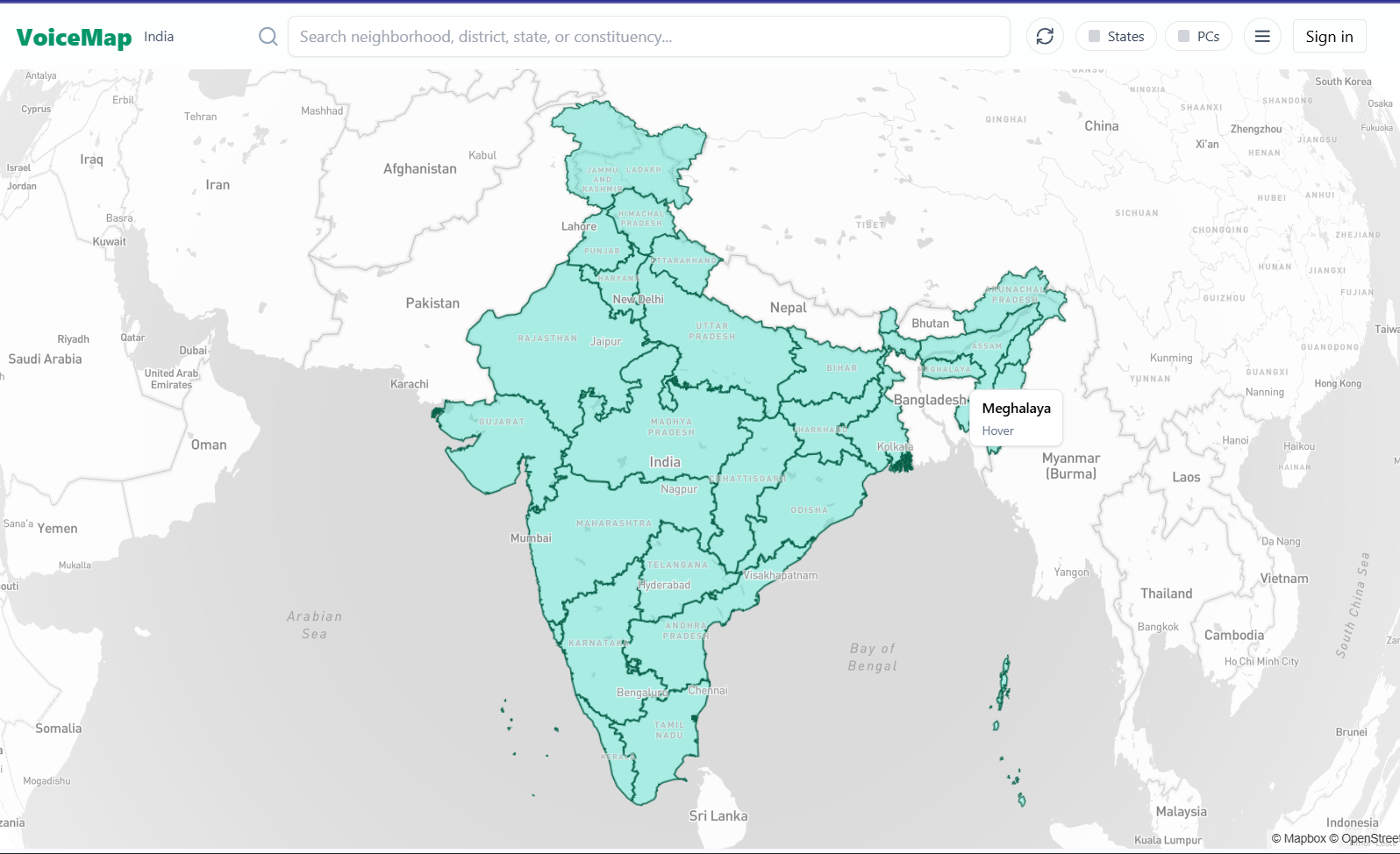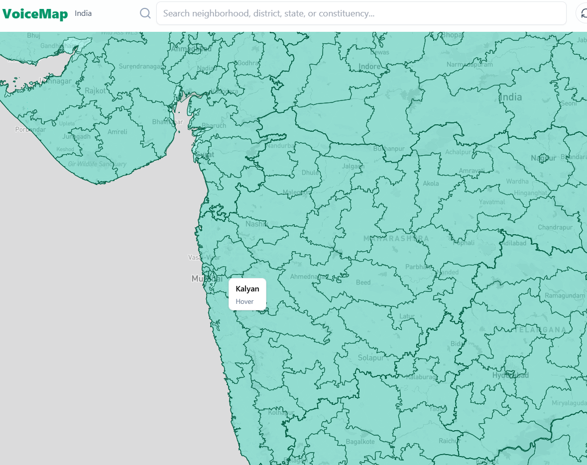 VoiceMap is an interactive civic mapping platform combining spatial datasets (states, districts, constituencies, pincodes) with representative contact information. Users can find their constituency by pincode, district, or name and view their MP/CM details.